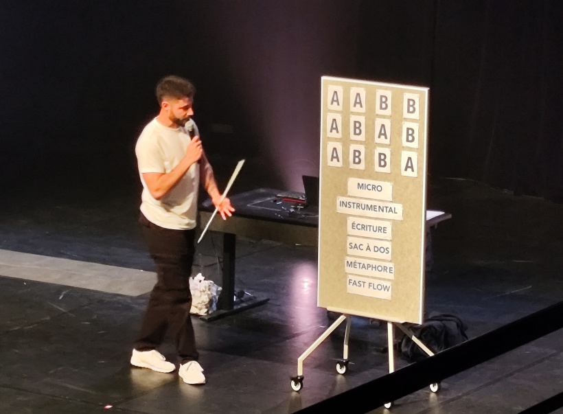Voilà par exemple ce que leur enseigne l'artiste, l'art de la rime et les différentes formes qu'elle peut prendre. Rimes plates (AA BB), rimes croisées (AB AB), rimes embrassées (AB BA). Rimes pauvres, avec un seul son en commun, rimes riches, rimes multisyllabiques...