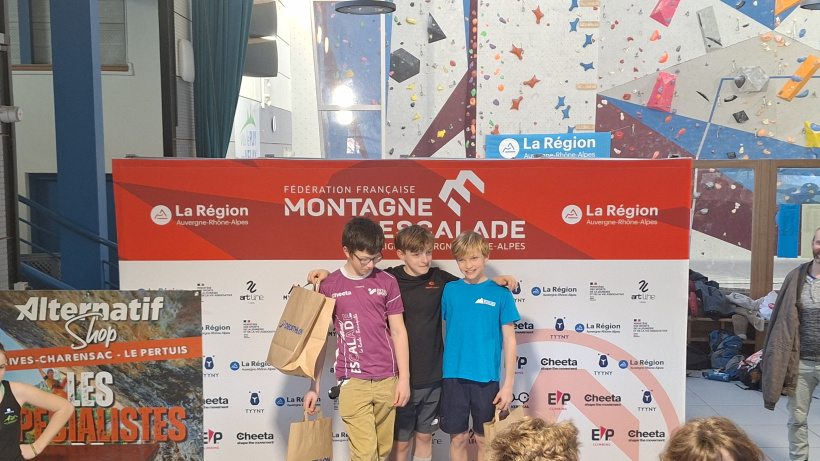 U15 Garçons : 1er ex-aequos Nolan Costes de « Source Libre Escalade » et Elie Tardy du « CAF La Roche Bonneville », 3ème : Antonin Roques de « Minéral Spirit ».