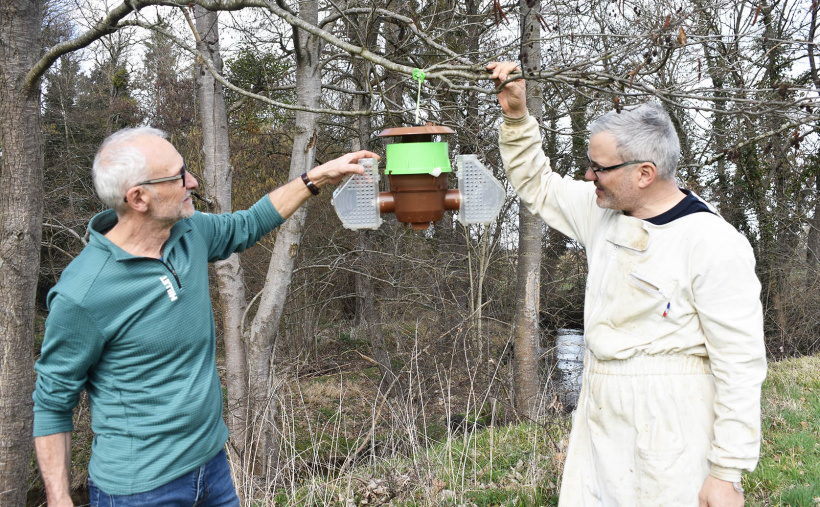 Christophe et Pascal, membres de l'association invitent chacun dès à présent à s'équiper de pièges. La période idéale venant de commencer et se terminant fin mai, date à laquelle les frelons européens sortent de leur nid. Le mieux est de disposer les pièges à 1m50 de hauteur dans un arbre, loin des ruches.