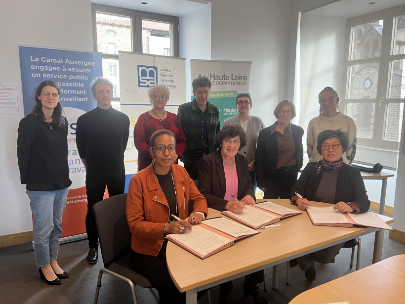 Ce mardi, Marie-Agnès Petit, présidente du Département de la Haute-Loire, a signé à l’Hôtel du Département une convention de coopération avec M. Jean-Christophe Crulli, directeur de la CARSAT Auvergne, et M. Frédéric Brance, directeur général de la MSA Auvergne, en présence de Florence Teyssier, vice-présidente et de Jean-Marc Boyer et Fanny Sabatier, conseillers délégués dans le domaine social.