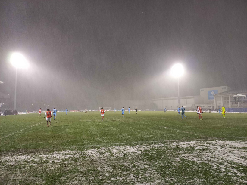 Le match continue en même temps que la météo se dégrade. La neige dans le ciel est de plus en plus dense, recouvre en partie le terrain, rendant la partie encore plus difficile.