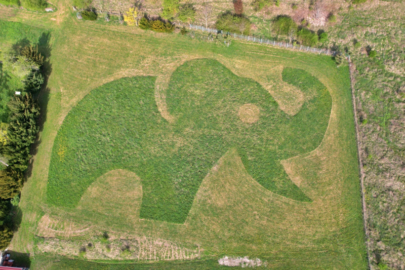 Depuis une quinzaine d'années cette parcelle située sur la commune de Vals est tondue partiellement pour y dessiner année après année Kangourou, escargot, dauphin, renard.... et cette année un éléphant.
