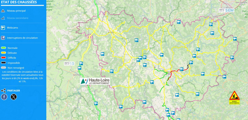 Sur le réseau routier, c'est un peu délicat de se déplacer sur certaines routes du département. Toutes subissent cet épisode neigeux. Par exemple, c’est délicat de rouler sur la D103 entre Le Puy et Vorey, mais aussi sur al D105 entre Yssingeaux et Monfaucon. La N88 entre Saint-Hostien et Les Baraques est en rouge, ça veut dire circulation difficile pour chaussée enneigée. Circulation jugée même "impossible" entre Saint-Hostien et Le Pertuis sur la N88 selon Inforoute43. Deux poids-lourds ont été bloqués dans les deux sens.
