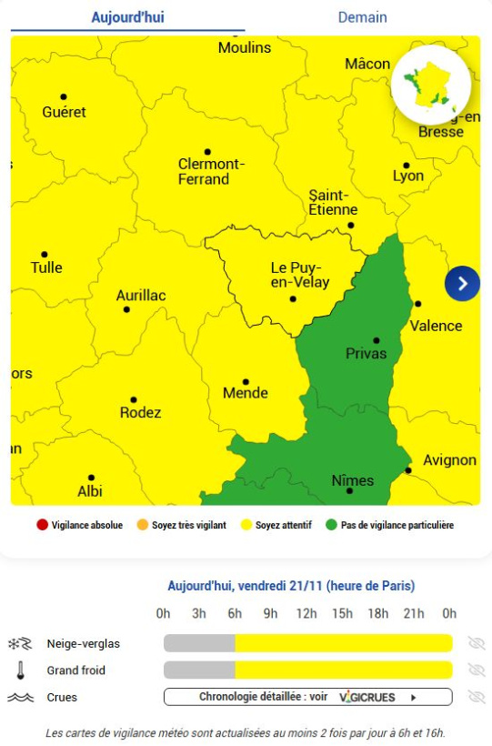 La prudence est de mise aujourd'hui, si vous devez emprunter les routes de Haute-Loire. Il va pas mal neigé ce vendredi et les températures seront négatives toute la journée sur l'ensemble. À noter que la Haute-Loire est classé en vigilance jaune "neige-verglas" et "grand froid" ce vendredi. La circulation est délicate sur l'ensemble du réseau routier, la chaussée étant plus ou moins enneigée selon les endroits. Il est donc vivement conseillé d'adapter sa vitesse.