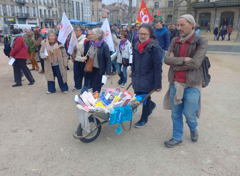 On retrouvait également des membres de la librairie itinérante "Pied de biche et marque-page". Ses membres participent à de nombreuses manifestations, venant avec des brouettes pleines de livres en lien avec l'événement. En l'occurrence, pendant la matinée, essais, philosophie, BD, contes ou encore biographies féministes débordaient de ces cuves métalliques.