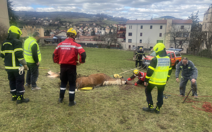 Beaucoup plus de peur que de mal pour Pépère, un imposant cheval comtois de 14 ans totalement bloqué dans une excavation une heure durant. Dans le pré au-dessus de la Clinique Bon Secours, en fin de matinée, l’équipe des USAR 43 (Unité de Sauvetage Appui et Recherche) s’est acharnée à extirper cette victime de près d’une tonne.