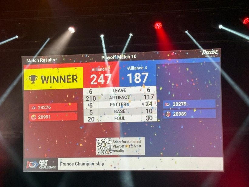 L’équipe a remporté quatre de ses cinq matchs, se classant 6ᵉ sur 36 équipes. Ce résultat leur a permis de participer aux playoffs en tant que capitaine d’alliance. Ils se sont associés aux BaguetTechs de Valbonne et ont mené leur alliance jusqu’au match final.
