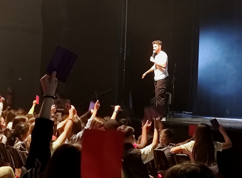 Les élèves interagissent alors tout le spectacle avec Cléon, qui leur propose même de composer un refrain avec lui. Le spectacle est pédagogique, léger et puissant à la fois quand l'artiste prend le micro pour interpréter ses titres ou improviser quelques morceaux avec une insolente... facilité.