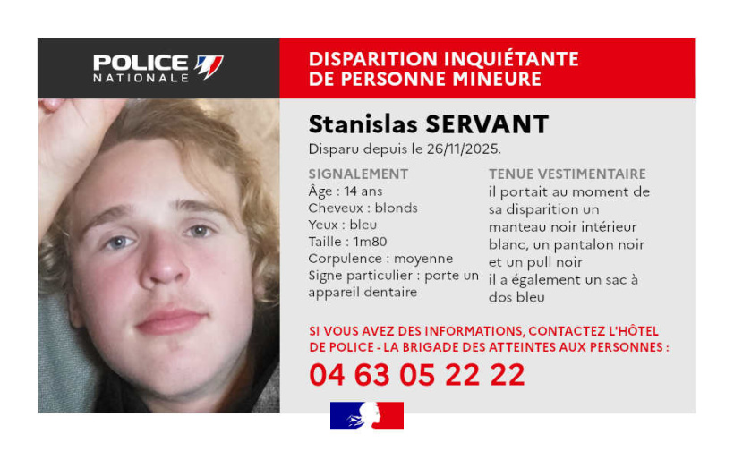 "Depuis le 26 novembre 2025, secteur jardin Lecoq à Clermont-Ferrand, personne n'a revu Stanislas Servant, 14 ans. Sans téléphone, il est impossible à localiser" selon la police nationale du Puy-de-Dôme, qui précise : "Départ possible vers la Pologne (famille maternelle)."
