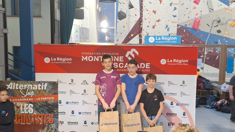 U15 Garçons : 1er ex-aequos Nolan Costes de « Source Libre Escalade » et Elie Tardy du « CAF La Roche Bonneville », 3ème : Antonin Roques de « Minéral Spirit ».