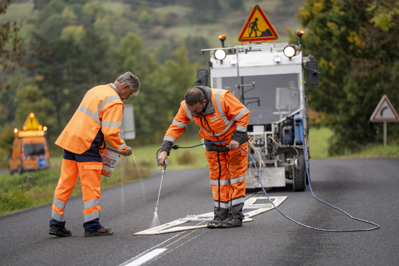 Nous gérons la signalétique des 3 400 km de routes départementale. Nous nous occupons notamment du marquage « horizontal », autrement dit le marquage au sol qui délimite les voies de circulation. Soit nous intervenons pour redonner un coup de peinture sur des tracés qui s’effacent avec le temps, soit pour créer les lignes blanches sur des chantiers récents où il n’y pas encore ou plus de marquage au sol.