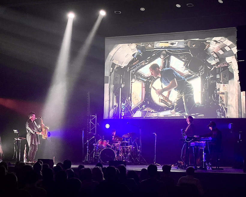 Le temps est alors suspendu, dans la salle Animatis, quand Guillaume Perret se met à jouer face à l'image de Thomas Pesquet flottant dans la coupole, deux saxophones à l'unisson, deux âmes connectées par la musique, à travers le temps et l'espace.