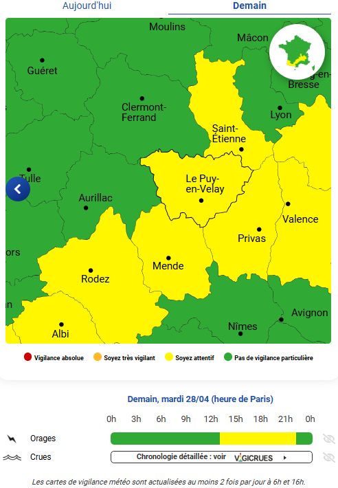 La Haute-Loire est placée en vigilance jaune aux orages ce mardi 28 avril, entre 15h et 22h, selon les prévisions de Météo France. Ce mardi sera donc marqué par un ciel très nuageux avec le retour des averses de pluies, qui s’accompagneront d’orages en fin de journée. Au total, cinq départements de la région sont concernés par cette vigilance jaune : la Loire, la Haute-Loire, l’Isère, l’Ardèche et la Drôme.