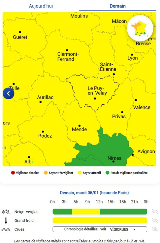 Parallèlement, la Haute-Loire est également concernée par une vigilance jaune neige et verglas, en vigueur de 5h du matin à 12h le 6 janvier. Les routes pourraient être glissantes par endroits, rendant la circulation plus délicate. Les automobilistes sont invités à adapter leur vitesse et à se préparer aux conditions hivernales pour éviter tout accident.