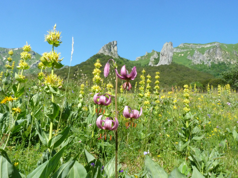 Parmi les espèces locales, certaines sont uniques : la Jasione d’Auvergne, endémique de Chambon-sur-Lac, et le Fenouil des Alpes, qui parfume le Saint-Nectaire et la viande AOP du fin gras du Mézenc. D’autres plantes étonnantes, comme la Pédiculaire feuillée ou le Trolle d’Europe, révèlent des stratégies surprenantes de parasitisme et de mutualisme avec les insectes.