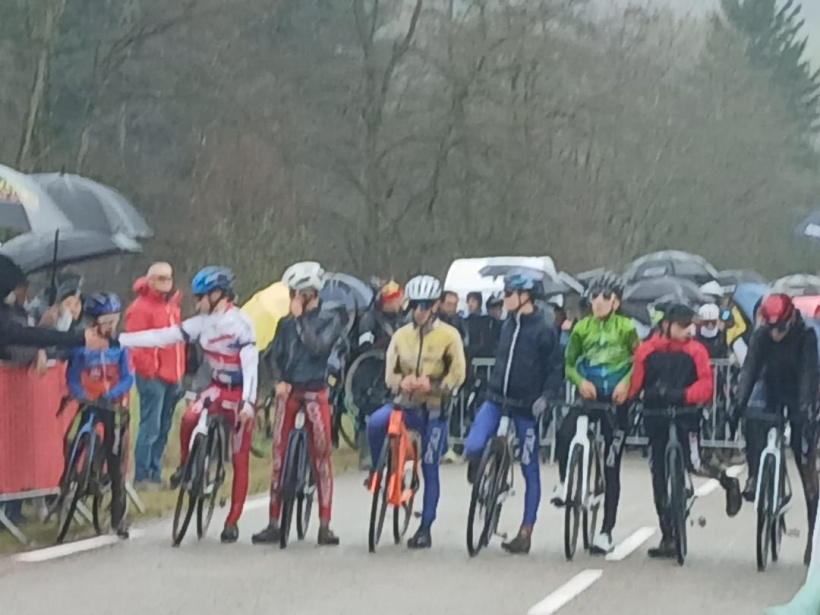 Les U17 (cadets) ont couru le dimanche matin sous une pluie continue. Antoine Bonnaud, bien parti en première ligne, remontait progressivement vers le podium lorsqu’une chute due à une ornière et un piquet mal protégé lui a infligé une blessure à la main, le contraignant à abandonner.