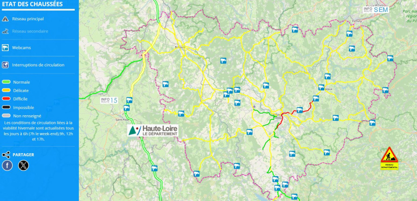 Sur le réseau routier, c'est un peu délicat de se déplacer sur certaines routes du département. Toutes subissent cet épisode neigeux. Par exemple, c’est délicat de rouler sur la D103 entre Le Puy et Vorey, mais aussi sur al D105 entre Yssingeaux et Monfaucon. La N88 entre Saint-Hostien et Les Baraques est en rouge, ça veut dire circulation difficile pour chaussée enneigée. Circulation jugée même "impossible" entre Saint-Hostien et Le Pertuis sur la N88 selon Inforoute43. Deux poids-lourds ont été bloqués dans les deux sens.