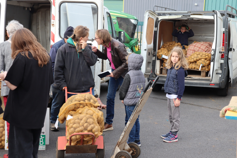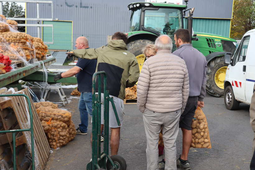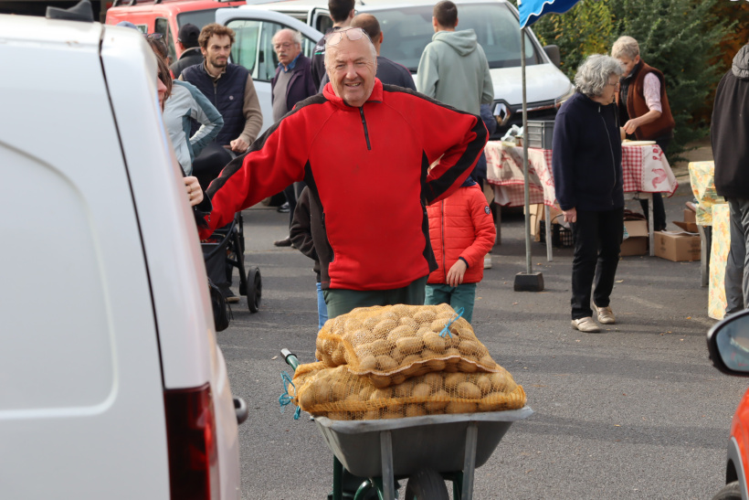 Au détour d'une benne remplie de sacs de patates, Jérôme et Rose sont venus de Saint-Etienne pour l'occasion. "C'est la première fois qu'on vient, on en a entendu parler sur les réseaux" confient-ils. Un peu plus loin, Bernard repart de la foire avec une brouette remplie de patates, il nous dit : "C'est une habitude pour moi, chaque année je viens faire mon stock !" puis repart charger sa voiture.