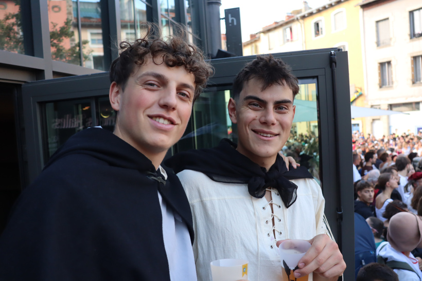 Rémi et Maxime, surplombant la foule, observent le couple royal qui reçoit des offrandes lors de la cérémonie, place du marché couvert.