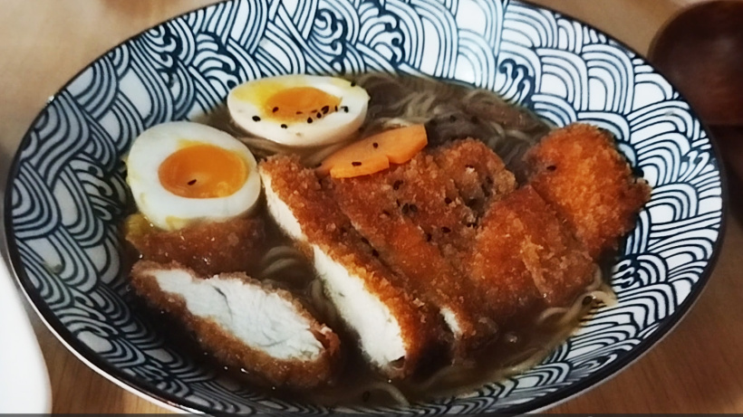 Le repas s'est poursuivi avec le Ginger Shoyu Ramen Poulet Katsu. Un beau bol fumant bien garni avec un oeuf, du poulet pané, des champignons et des pâtes fines dans un bouillon au gingembre. Des goûts marqués et une quantité justement équilibrée !