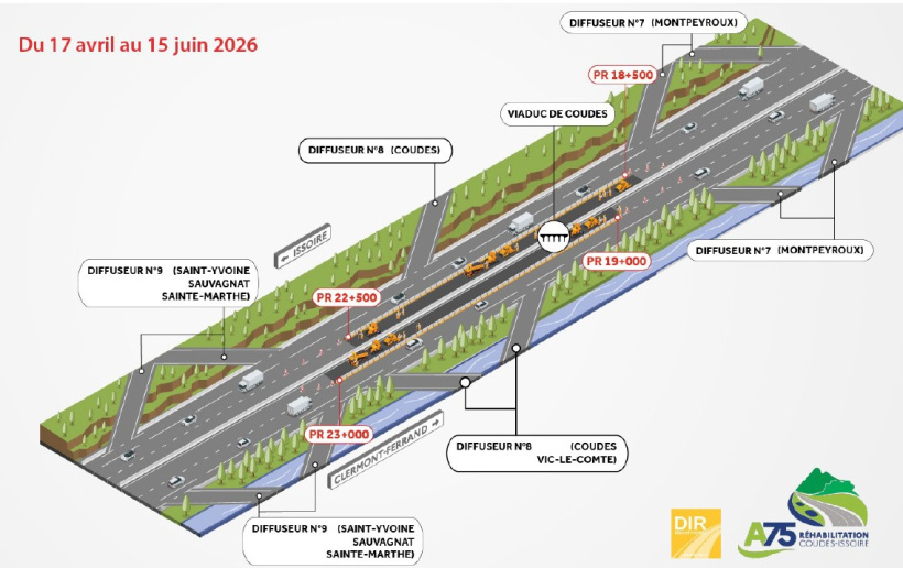 Les voies de gauche (voies rapides) seront neutralisées dans les deux sens entre les diffuseurs n°7 « Montpeyroux » et n°9 « Saint-Yvoine, Sauvagnat-Sainte-Marthe », sur environ 4 km ;