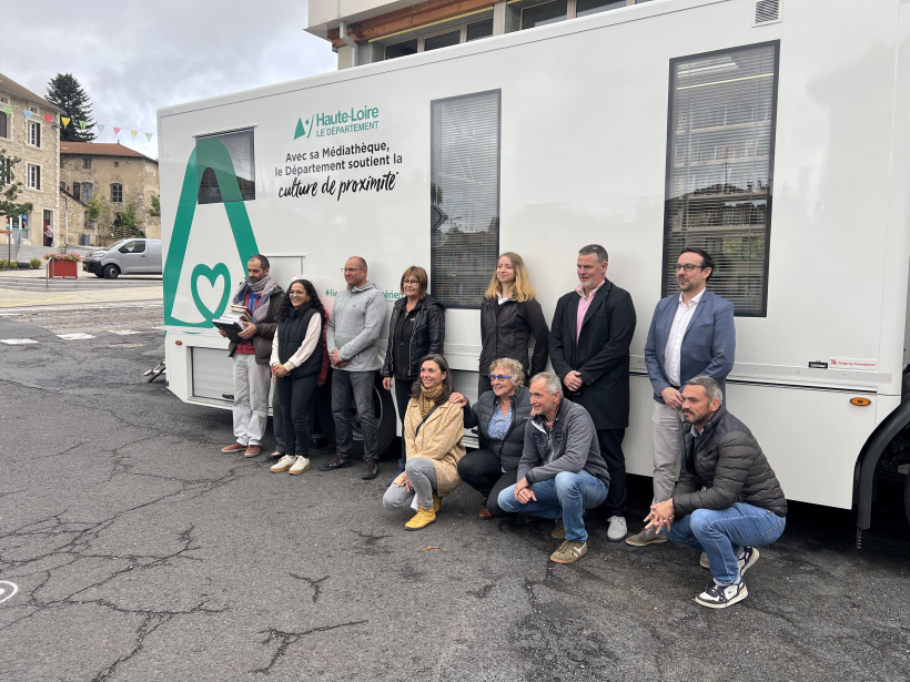 Marie-Agnès Petit, Présidente du Département de la Haute-Loire et Brigitte Renaud, Vice-présidente en charge de la Lecture publique, ont inauguré ce jeudi 25 septembre à La Grenette à Craponne-sur-Arzon, le nouveau Bibliobus de la Médiathèque départementale, en présence des bénévoles de la médiathèque et des représentants des entreprises ayant participé à sa conception. Plus moderne, plus ergonomique et plus respectueux de l’environnement, ce nouvel équipement incarne la volonté du Département de renforcer la proximité culturelle sur l’ensemble du territoire.