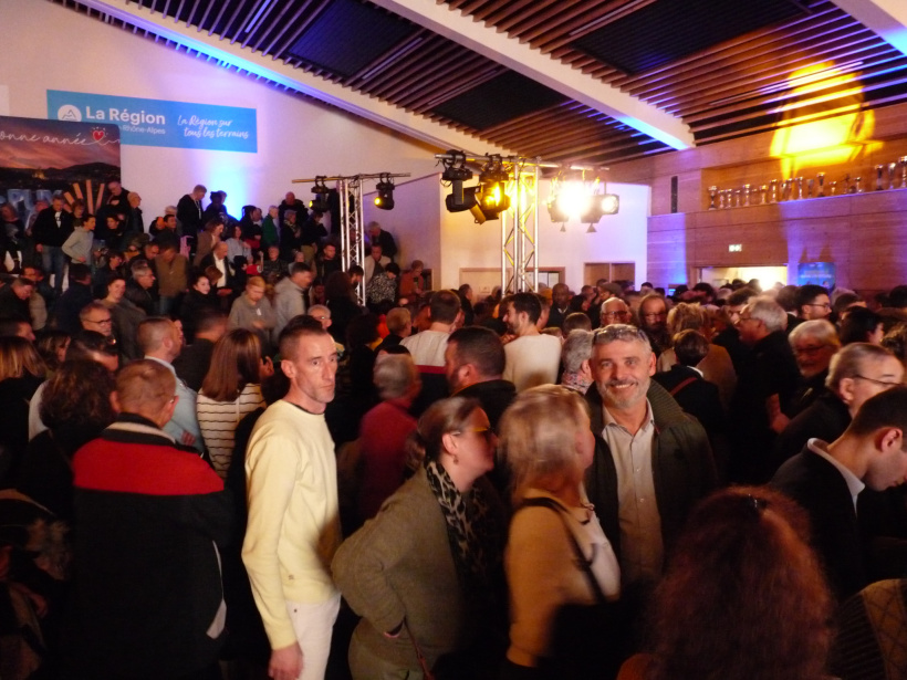 La halle multisports de Quincieu a débordé de plusieurs centaines de personnes dès 19 h 00 ce vendredi 16 janvier, avec des stationnements anarchiques sur trottoirs, pistes cyclables et avenue de Bonneville, tolérés par une police nombreuse mais qui n'a pas semblé interventionniste. Une file d’attente s’est étirée dehors tandis qu’un buffet en enfilade canalisait le flux intérieur vers la grande salle de judo où avait lieu la cérémonie.