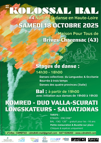 Une journée de stages, une nuit de bal, quatre groupes et une promesse : danser jusqu’à perdre pied ! Le Kolossal Bal revient à la MPT de Brives-Charensac pour une nouvelle édition résolument festive.