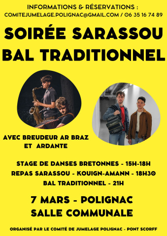 Le samedi 7 mars prochain le comité de jumelage Polignac - Pont Scorff, organise dans les locaux de la salle communale de Polignac, une soirée sarassou et bal traditionnel avec un programme très attractif.