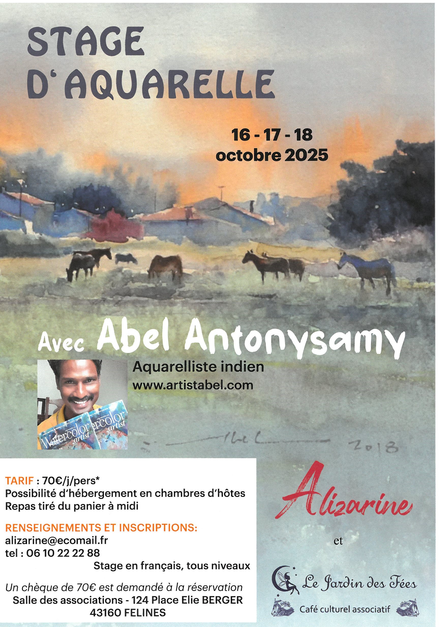 Stage d'aquarelle avec Abel Antonisamy, artiste indien. Ouvert à tous. Repas en commun. Possibilité d'hébergement en chambres d'hôtes.